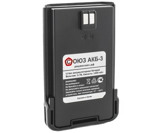 Литий-ионный аккумулятор СОЮЗ-3 имеет ёмкость 1400 мАч и питание в 3,7В. Работает с радиостанцией СОЮЗ-3.