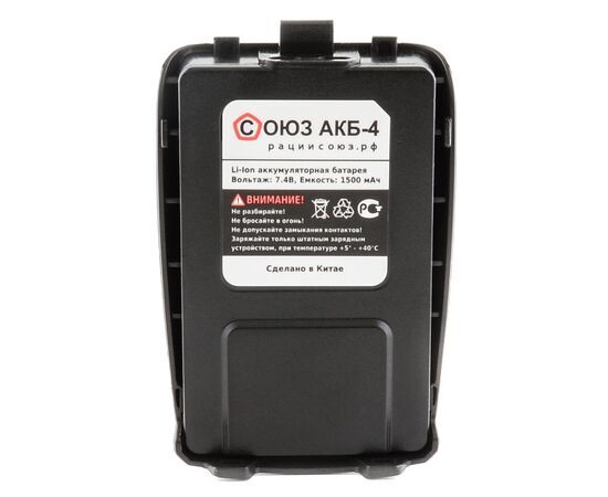 Литий-ионный аккумулятор СОЮЗ-4 имеет ёмкость 1500 мАч и питание 7,4В. Работает с радиостанцией СОЮЗ-4