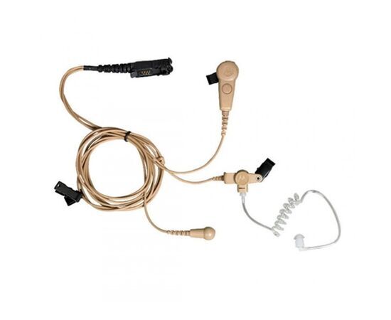 Трехпроводная гарнитура скрытого ношения Motorola PMLN6755 выполнена в бежевом цвете, оснащена прозрачной акустической трубкой, микрофоном и кнопкой РТТ.