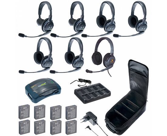Комплект UltraLITE & HUB Eartec HUB 7-24MXD на 7 абонентов с гарнитурами 2 Single 4 Double 1 Max 4G Double. Батареи, зарядное устройство и сумка в комплекте.