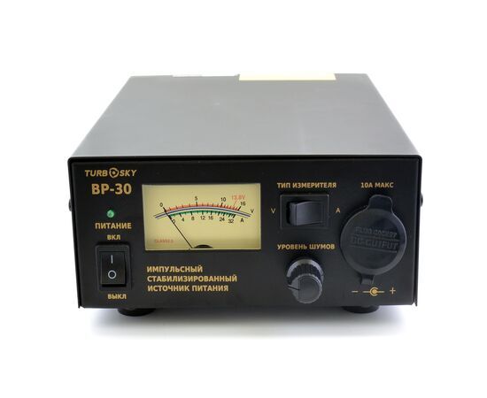 BP-30 импульсный — компактный, обладающий высоким КПД блок питания. Блок питания предназначен для питания КВ и УКВ радиостанций, а также различного радиооборудования с напряжением питания 13,8 В. Для минимизации уровня шумов импульсного блока питания в устройстве расположен регулятор минимального уровня шумов импульсного блока питания. Модель оснащена комбинированным стрелочным измерительным прибором с подсветкой, для контроля напряжения (V) и силы тока (A). BP-30 имеет два выхода с клеммами различной конструкции для подключения устройств различного типа.