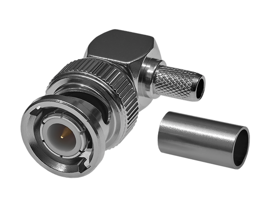 ВЧ разъем B-121F BNC, вилка, угловой, обжимной, под коаксиальный кабель RG-58, пин под цангу