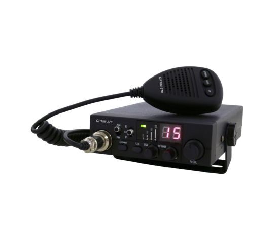 Автомобильная радиостанция Optim-270 для работы и общения в Си-Би диапазоне 25,615 - 28,305 МГц, включая гражданский Си-Би. Отличительными особенностями рации являются максимальная простота и продуманности организации управления, возможность выбора уровня выходной мощности - высокий до 10 Ватт и низкий до 4 Ватт, удобные тактильно ощутимые дискретные органы управления, наличие не только ручного порогового, но и автоматического спектрального шумоподавителя ASQ, возможность работы в "нулях" и "пятёрках".