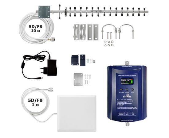 Комплект Titan-1800 PRO (14Y, LED) состоит из усилителя (репитера) Titan-1800 PRO (LED) и комплекта антенн Titan 1800/2100-14YF. Работает в стандартах связи GSM-1800 (2G), LTE1800 (4G).