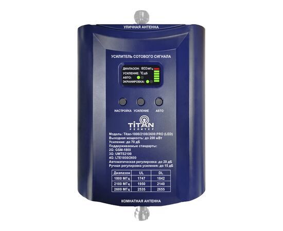 Репитер Titan-1800/2100/2600 PRO (LED) - является старшей моделью 1800/2100/2600-ой модели. Характерной особенностью этого усилителя является ручная регулировка и возросший раздающий сигнал до 1000 квадратных метров. Приятная цена, характерный дизайн, ручная/автоматическая регулировка, отличное качество исполнения и холодящий руку металл - вот что выделяет этот усилитель.