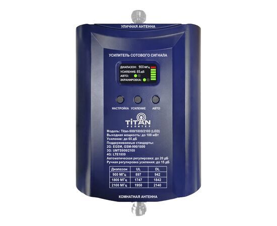 Репитер Titan-900/1800/2100 (LED) работает в стандартах связи EGSM/GSM-900 (2G), UMTS900 (3G), GSM-1800 (2G), LTE1800 (4G), UMTS2100 (3G), обеспечивая в полном объеме голосовую связь и интернет.